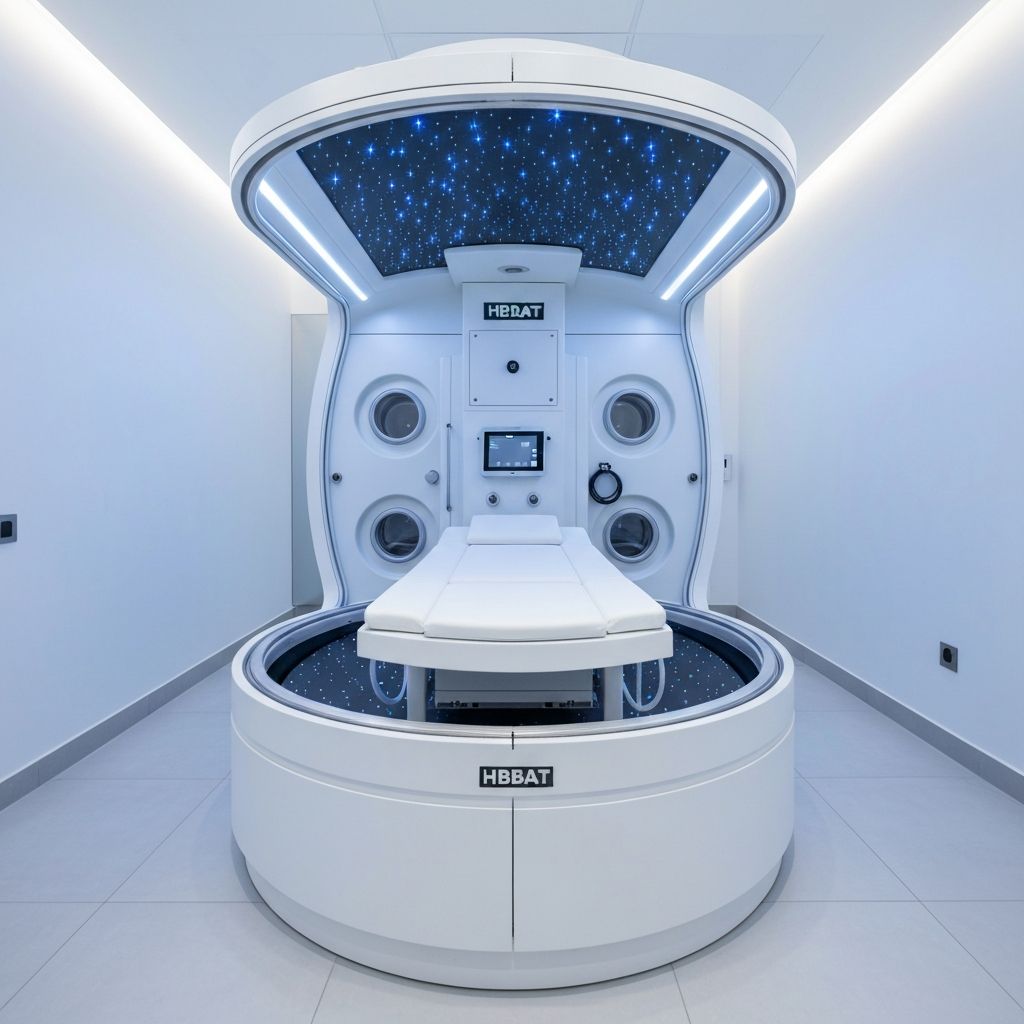 Hyperbaric oxygen therapy (HBOT) involves breathing pure oxygen in a pressurized chamber, significantly increasing oxygen levels in your blood and tissues. Our state-of-the-art OXYPRO ULTRA 6500 chamber features a premium starlight ceiling interior for a comfortable, relaxing experience.